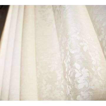 細かいボーダーが走るような無地調のアイボリーのベース。その中にふんわりと浮かび上がるシルエットのようなリーフモチーフが上品です。